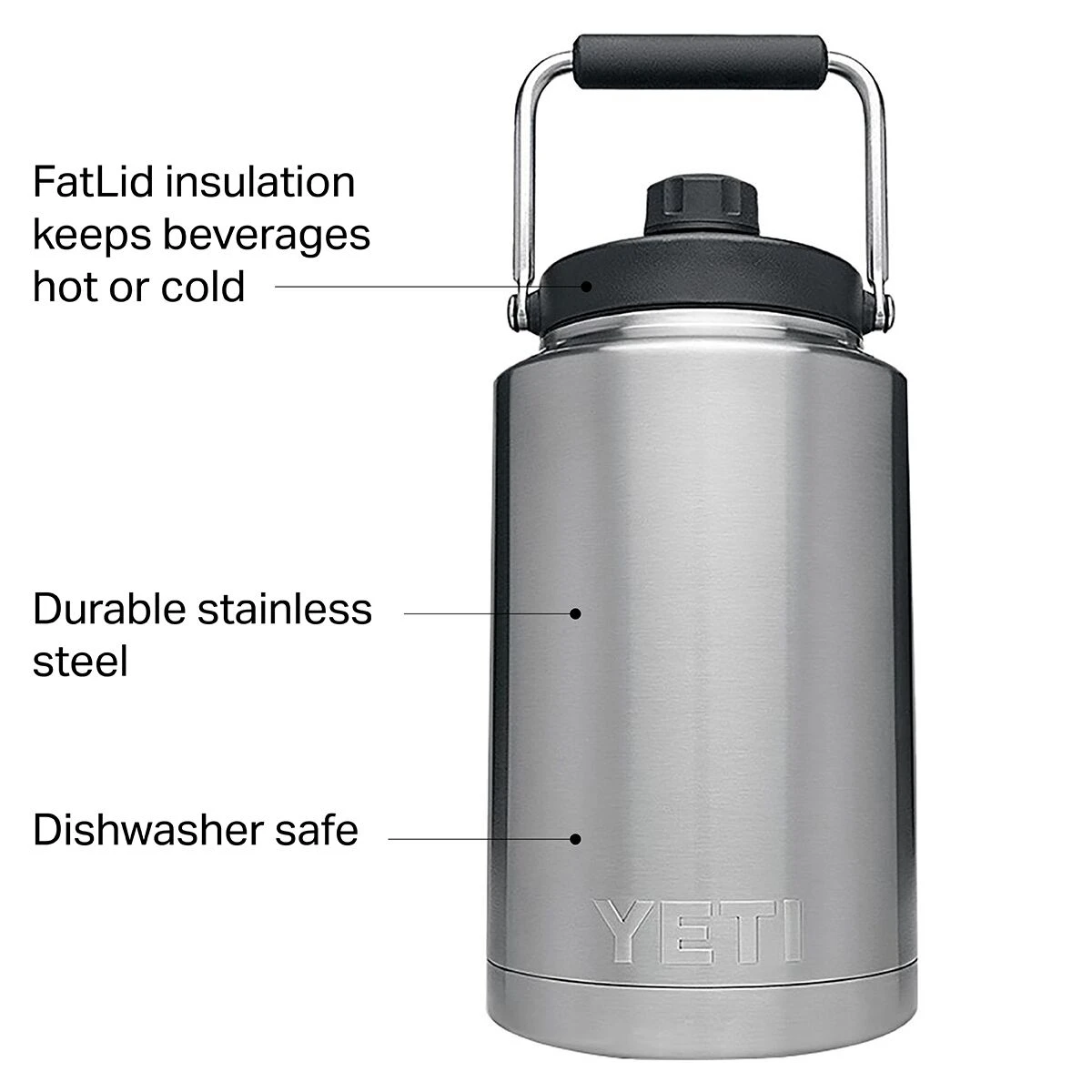 - Insulated gallon jug keeps beverages hot or cold